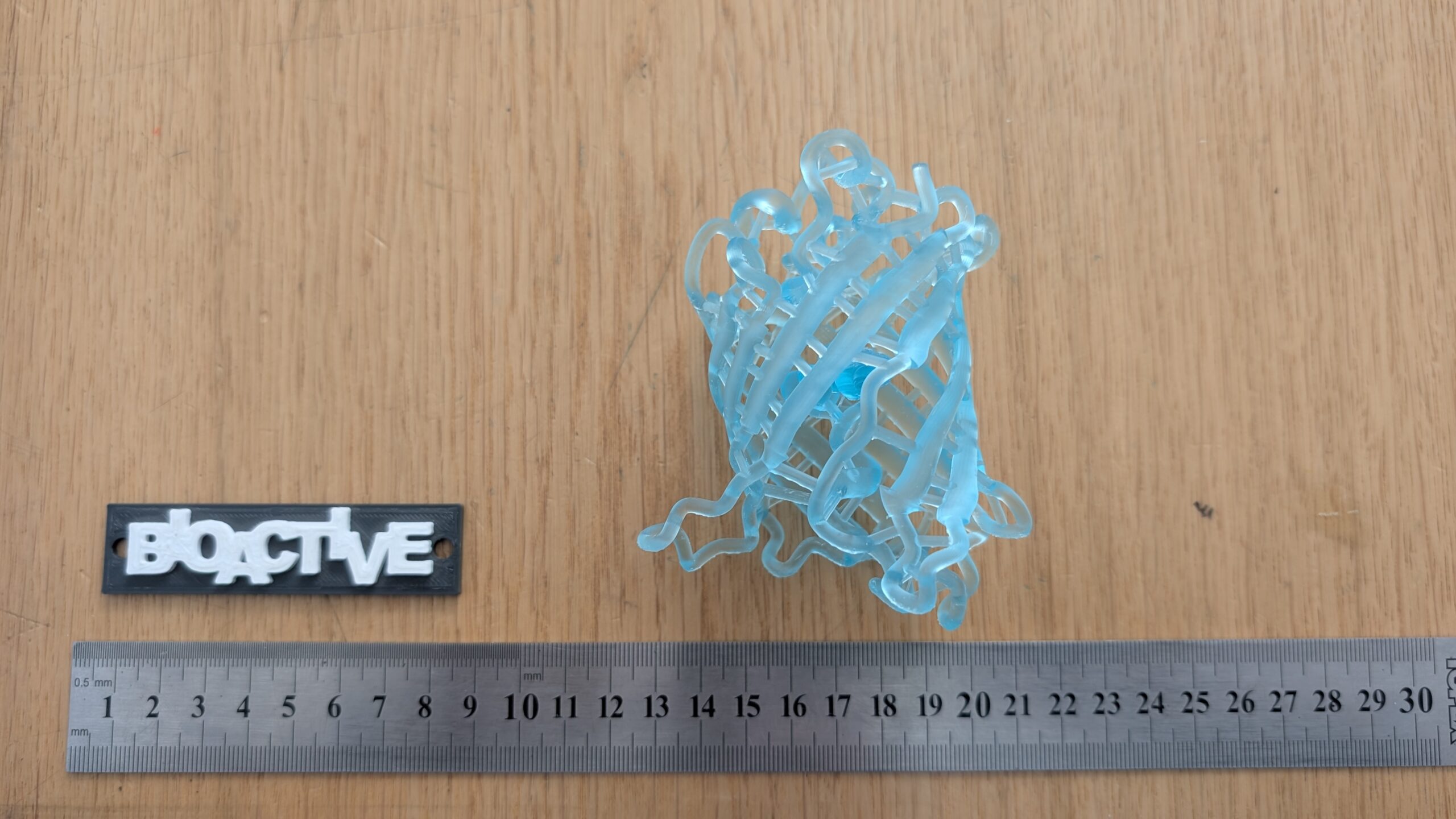 O alta versiune a modelulul GFP, de aceasta data a fost tipărită cu o imprimanta MSLA si puteți urmării procesul de tiparire mai jos. Model a fost generat cu 3DP-Jmol si tipărit in cadrul proiectului EDUMOL3D, PN-IV-P7-7.1-PED-2024-0343 finantat de UEFISCDI, Romania.